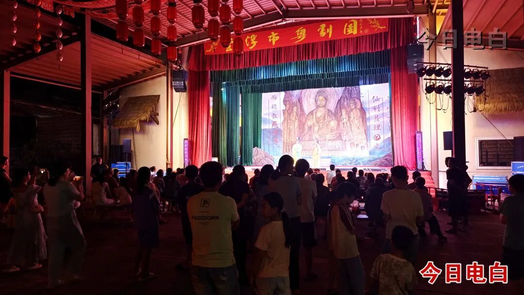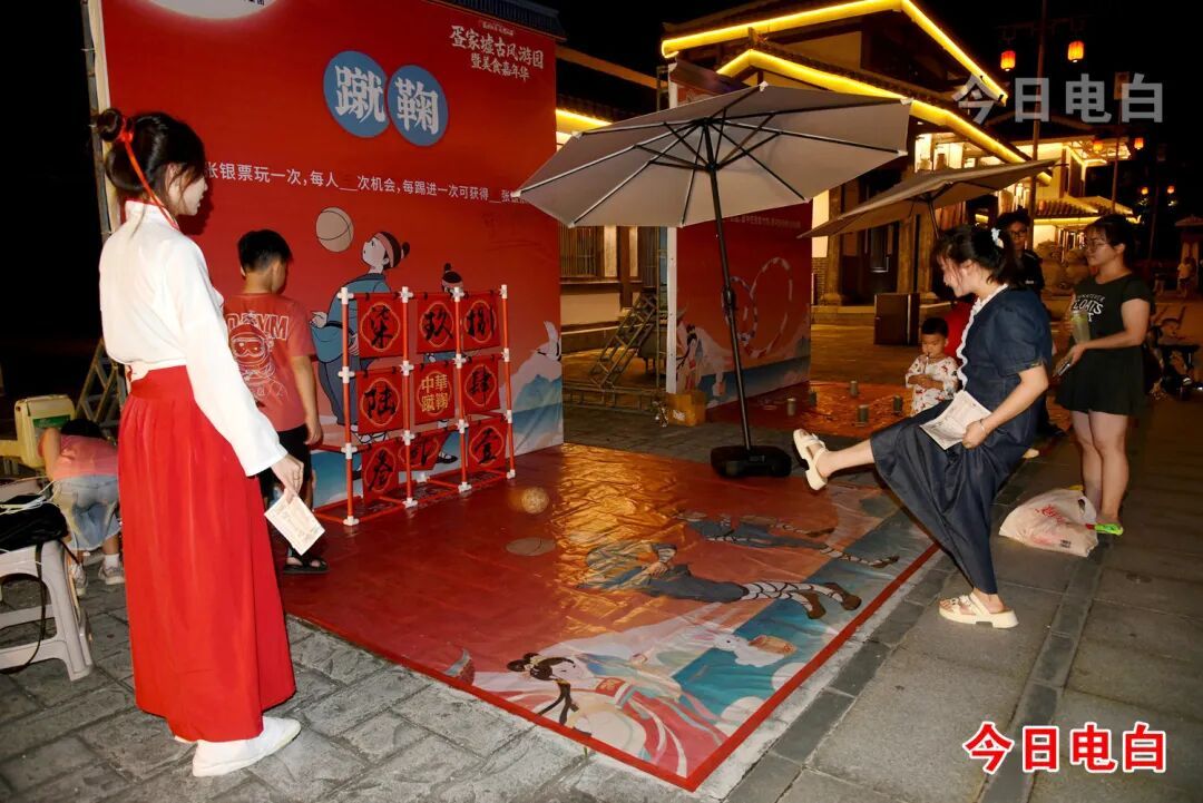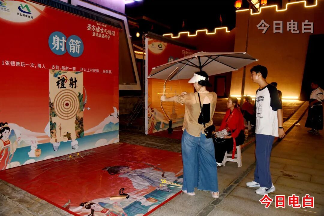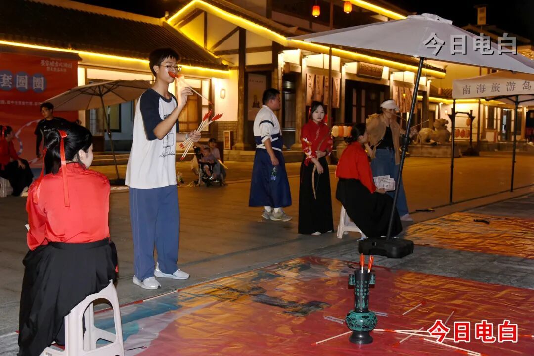 如果说中国第一滩的欢乐是激情奔放的,疍家墟的热闹则充满诗意与文化韵味。古色古香的建筑错落有致,红灯笼挂满屋檐,与青石板路、木质廊柱相映成趣。不少游客身着汉服、手持宫灯,仿佛穿越回千年前的渔家古镇。投壶、射箭、木偶戏、NPC情景互动等活动吸引大量游客参与,当晚的粤剧表演更成为亮点,台下掌声此起彼伏。