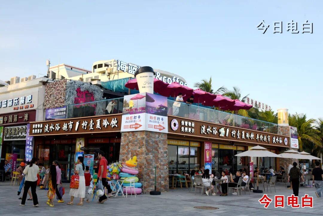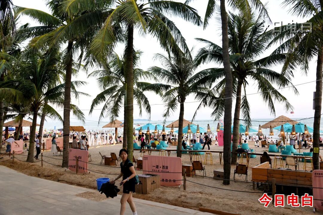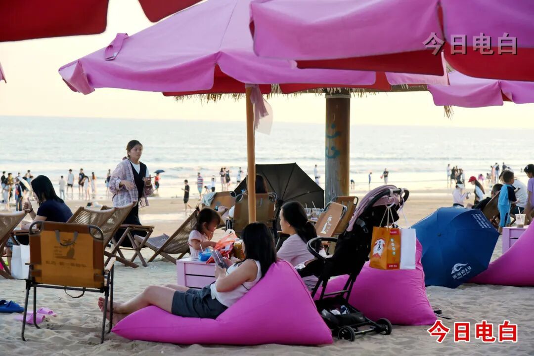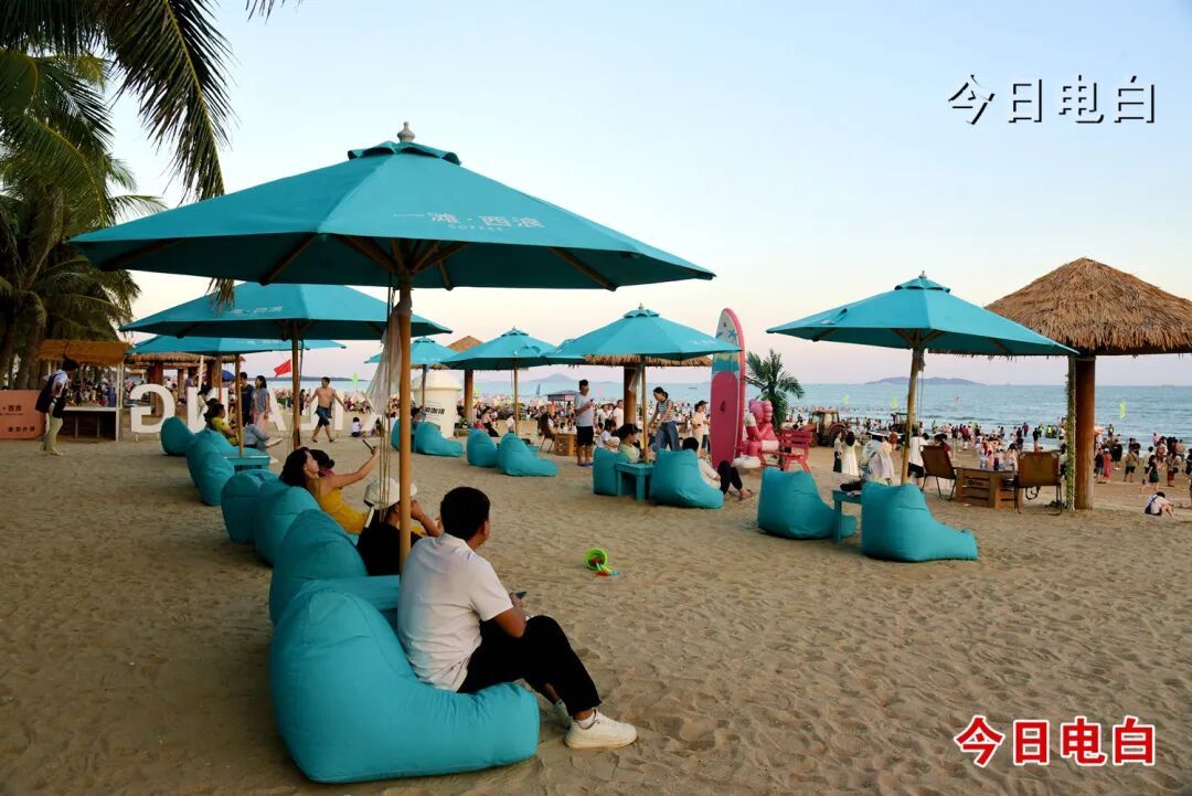 沙滩西侧的“西浪咖啡”成为不少游客的休闲首选。在蓝色、粉红色的遮阳伞下,懒人沙发随意摆放,空气中弥漫着咖啡与海风交织的清香。来自化州的林小姐正端着一杯柠檬茶,望着海面的落日笑道:“玩累了来这里坐一坐太舒服了,吹着海风喝着饮品,所有疲惫都被吹散,这才是假期该有的样子!”她提前做了攻略,知道这里有网红咖啡摊,特意留了一下午享受这份慢时光。