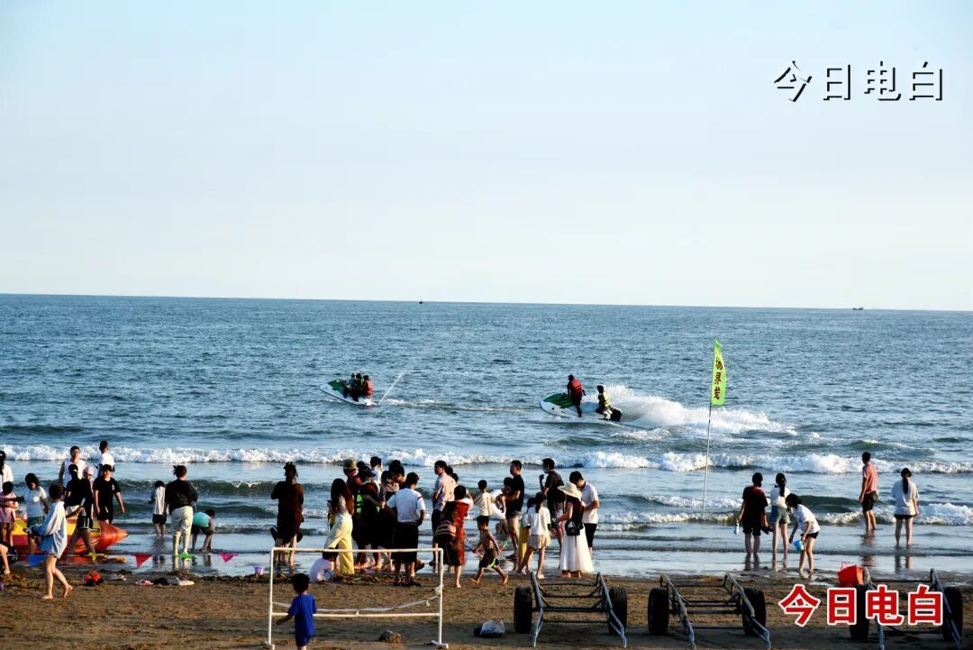 当天下午的中国第一滩,阳光洒在碎钻般的海面上,浪花轻卷,绵长的金色沙滩上人头攒动,欢声笑语此起彼伏。孩子们提着小水桶、握着沙滩铲,在家长陪伴下追逐浪花,任凭海水漫过脚踝,留下串串稚嫩脚印;年轻人们三五成群,或铺野餐垫分享美食,或举着相机记录海天相接的美景,或迎着海风奔跑,让烦恼随海浪消散。远处海面上,摩托艇划出白色弧线,与岸边人群构成一幅生动的滨海欢乐图。